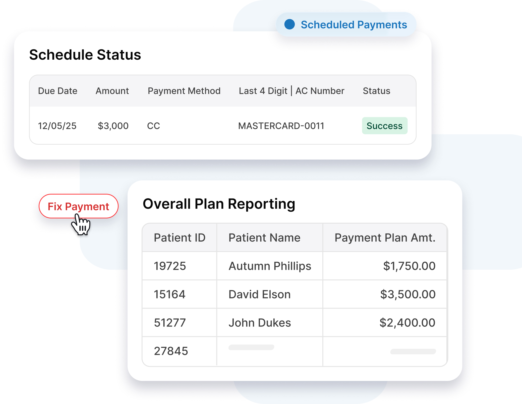 Use primary and secondary patient cards-on-file to automatically charge installments as per the agreed upon schedule.