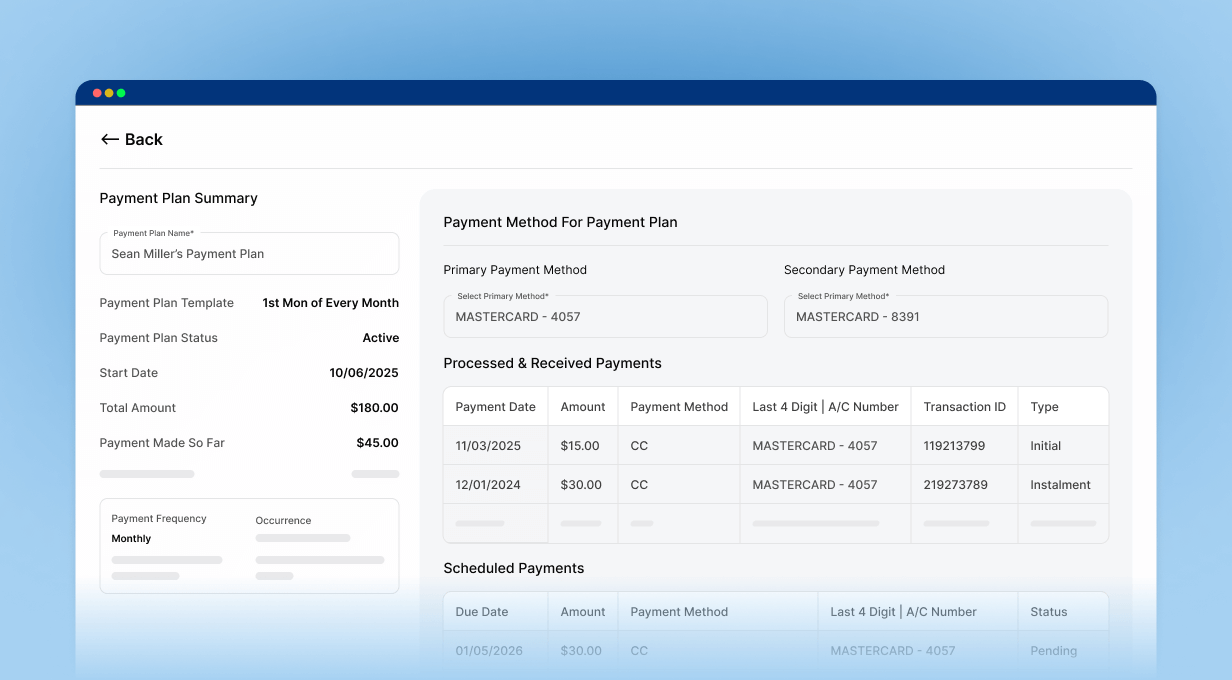 Yes, the system attempts to charge the primary payment method on the scheduled date so staff members don’t have to run every installment manually. If the primary method fails, it automatically retries with the secondary payment method on file before marking the payment as failed.